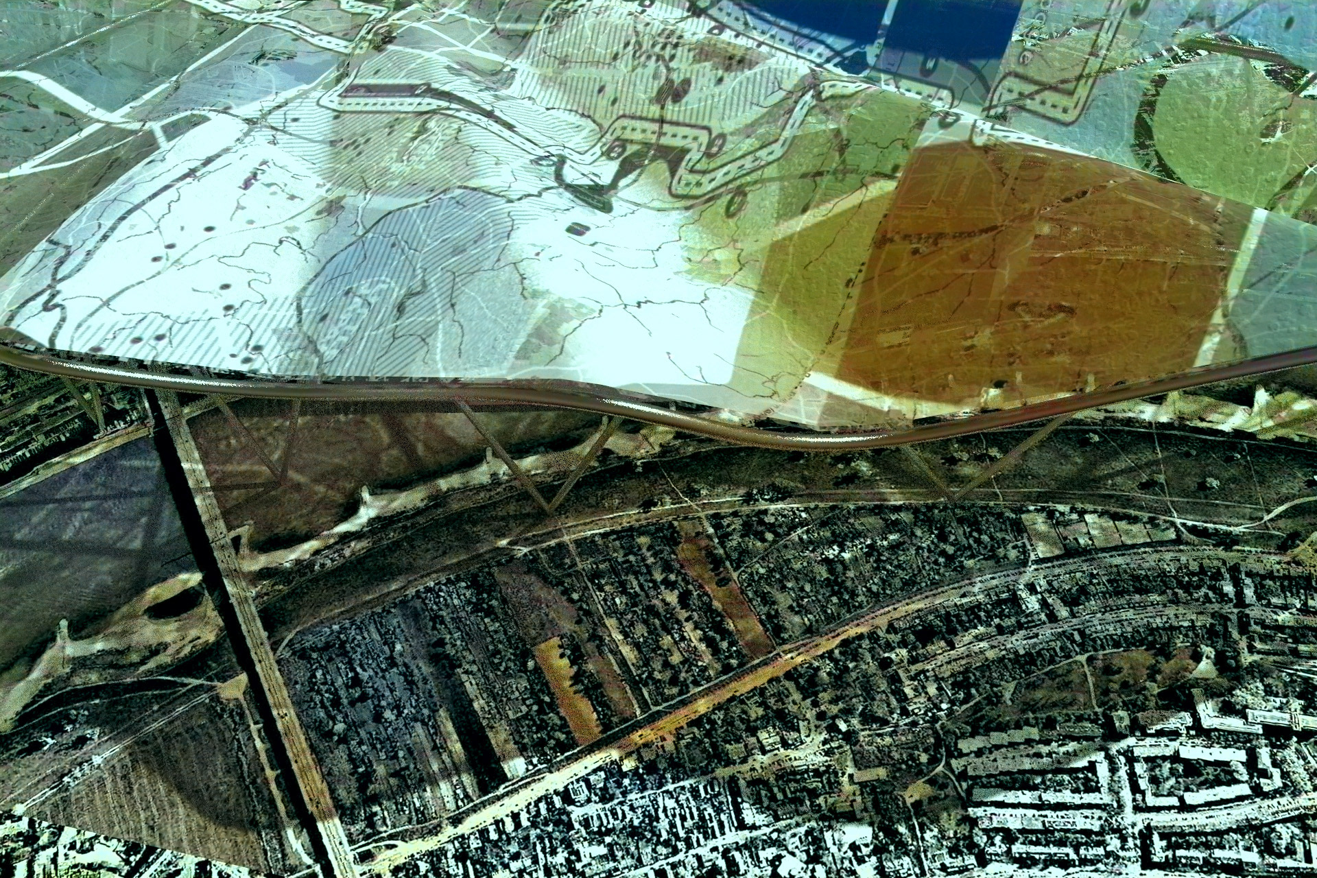 A pavilion at one edge of Koenigsallee at the Graf-Adolf-Platz in Dusseldorf. Translucent layers of printed surfaces overlap to produce a diorama of the many maps of the city. An electric map for the nomads of the metropolis.