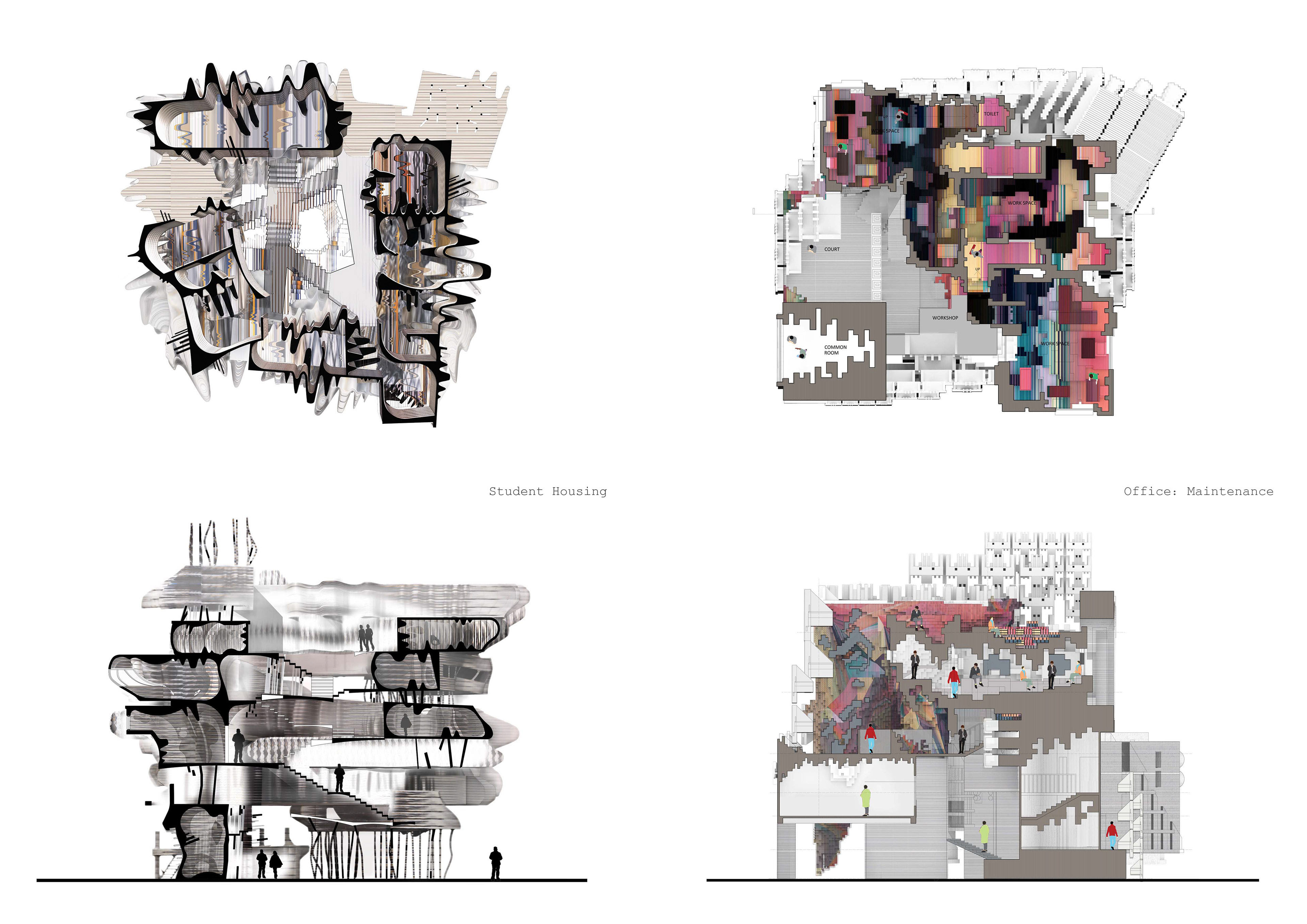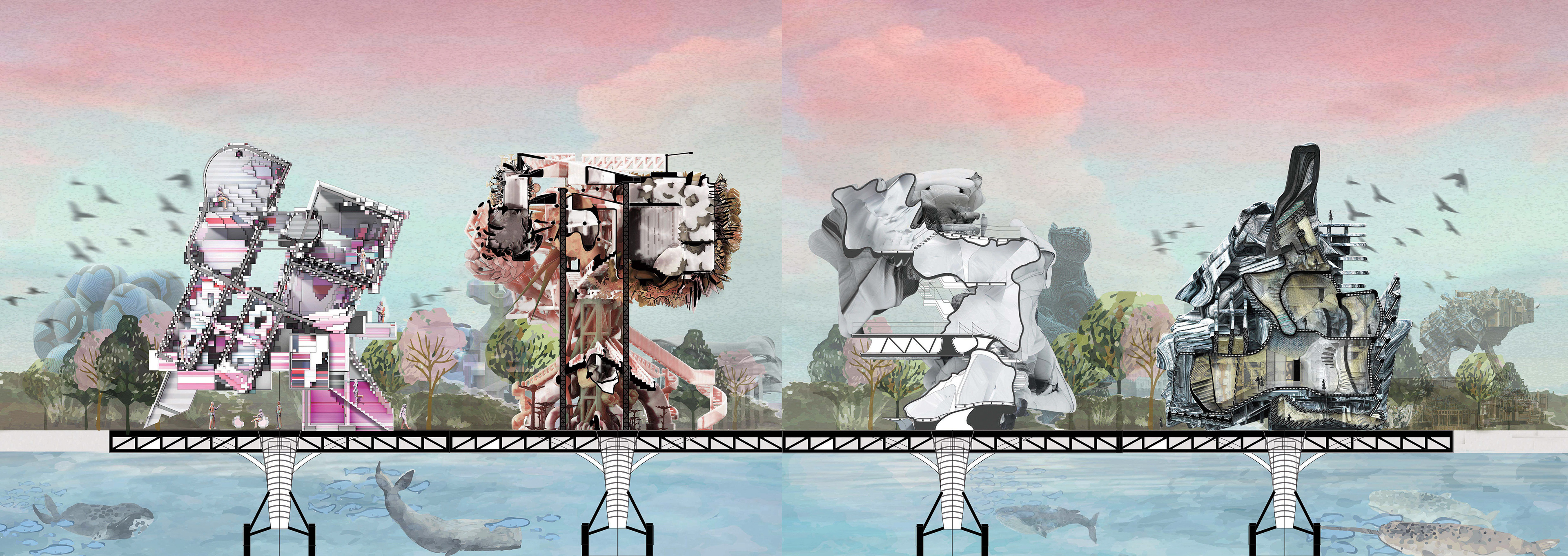Proposal for a University on the Island of Poveglia: "We refuse to build on the island and to participate in the politics of gentrification. We believe that the utopian project of architecture is dead, which is the precise reason for reinventing it. Our aim is to preserve the magic and the stories, and invent new ones. We propose a platform with 33 buildings, encircling the island, fulfilling the requested programme. The island becomes an oasis, and the buildings take the role of strange Venetian characters congregating for a Bal Masqué. The real is a strange place, get over it."